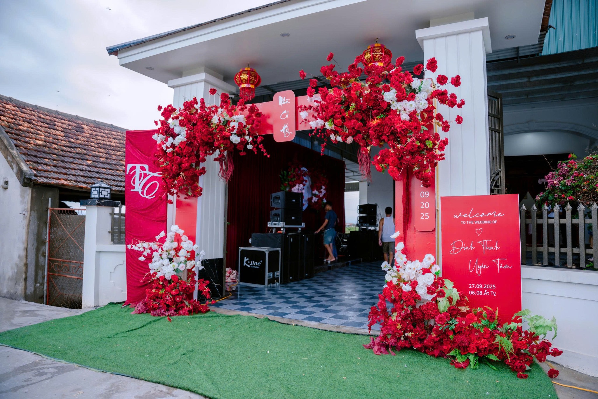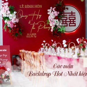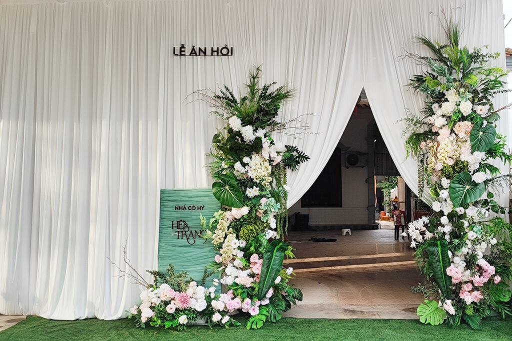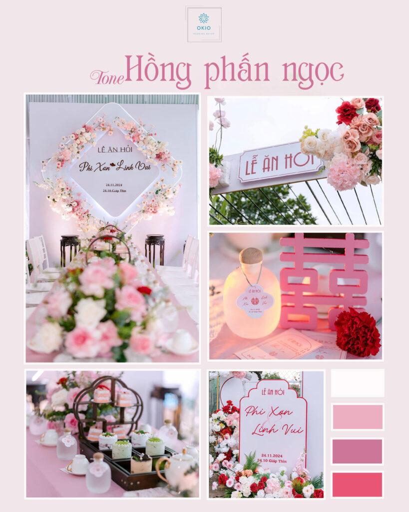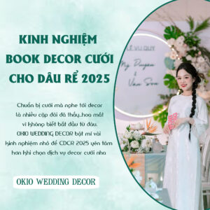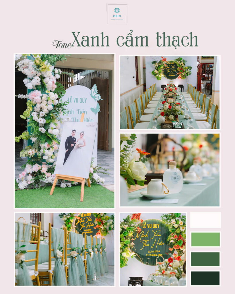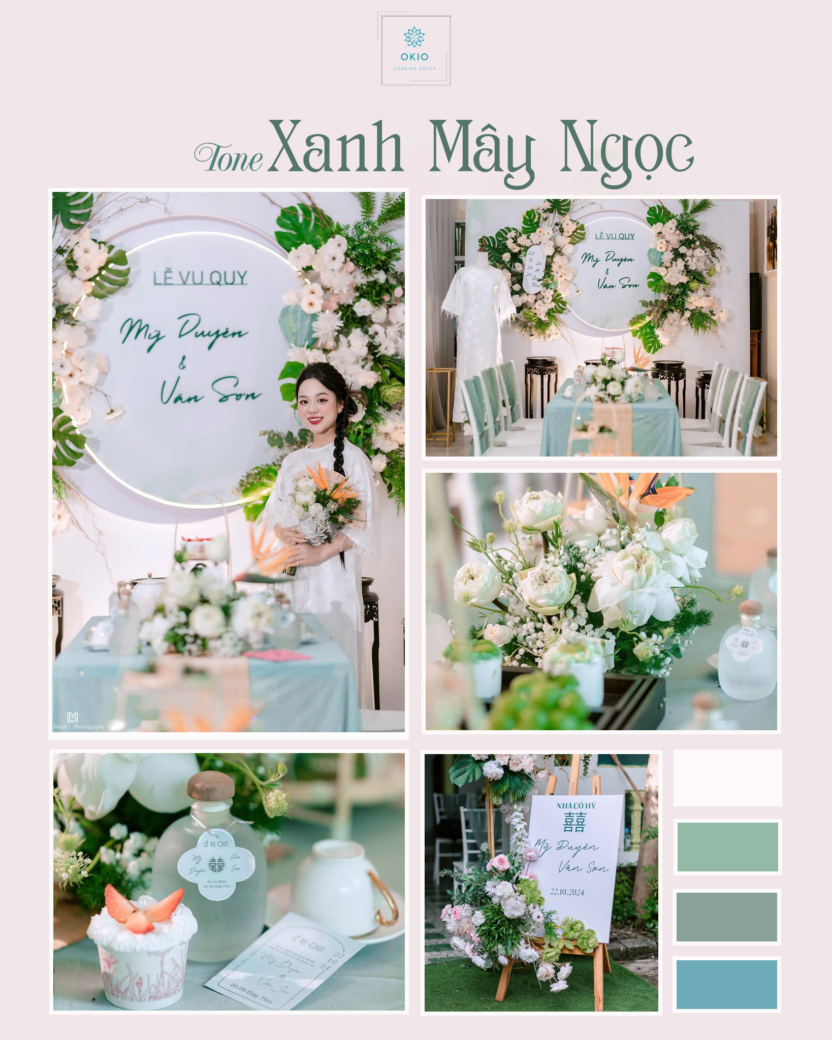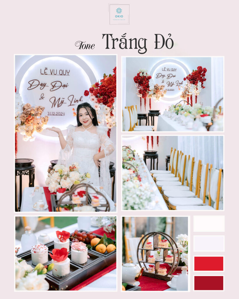 OKIO đã decor một chiếc back và phông cưới phù hợp hơn với không gian tư gia, trang phục, tráp cưới,… mà vẫn thể hiện được chất thẩm mỹ riêng. Từ khâu chọn hoa, lên 3D thiết kế, tư vấn từng cái cốc, khay đồ,… rất chu đáo, tỉ mỉ và lắng nghe yêu cầu của cô dâu, chú rể.