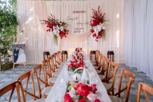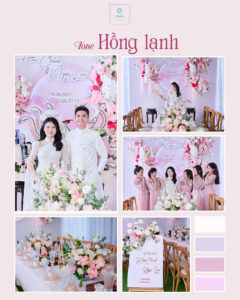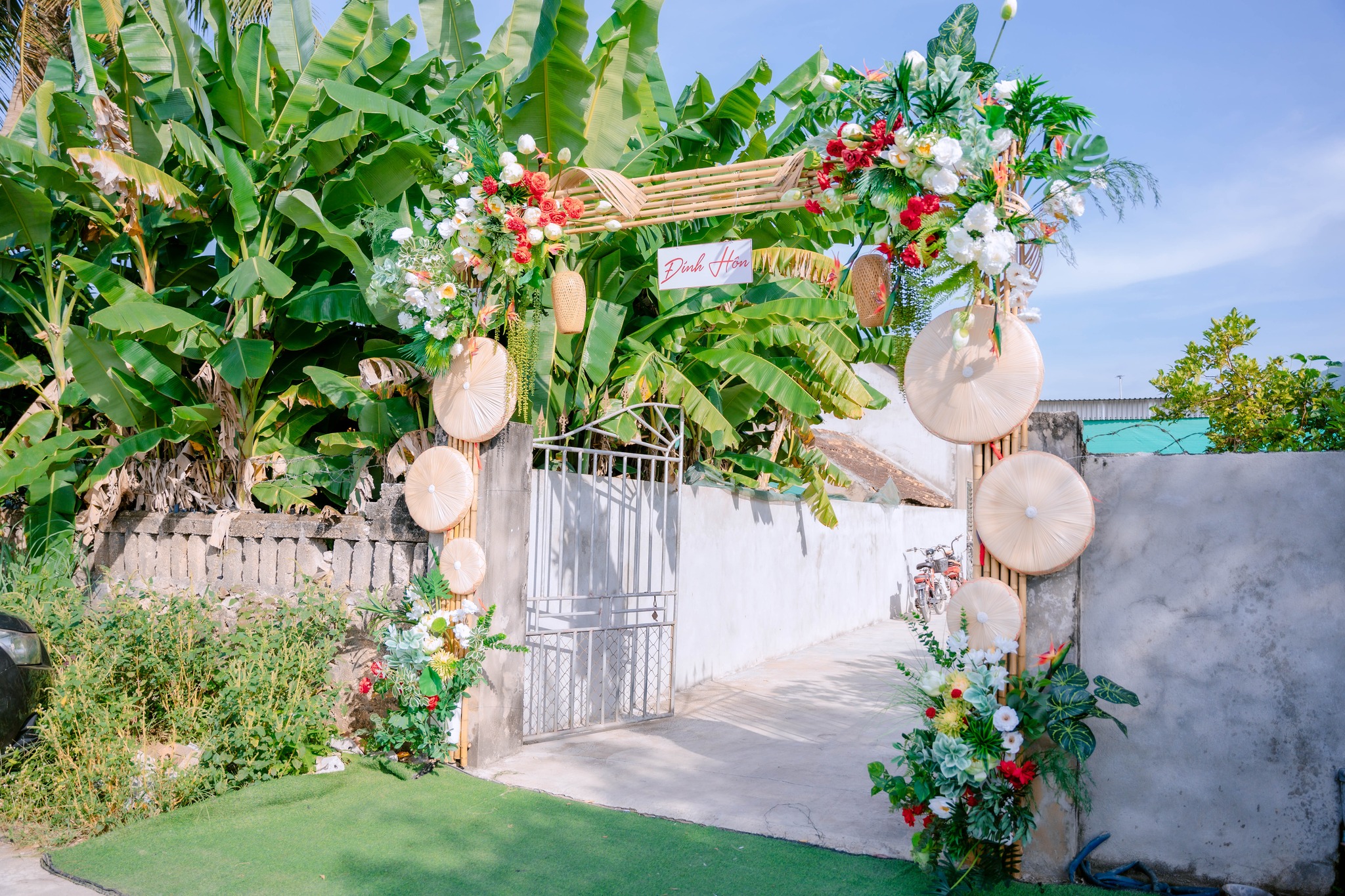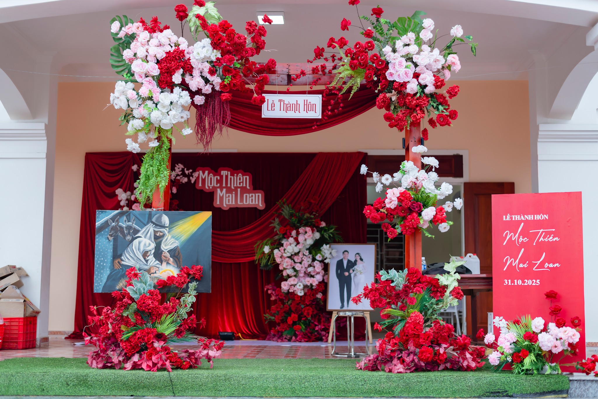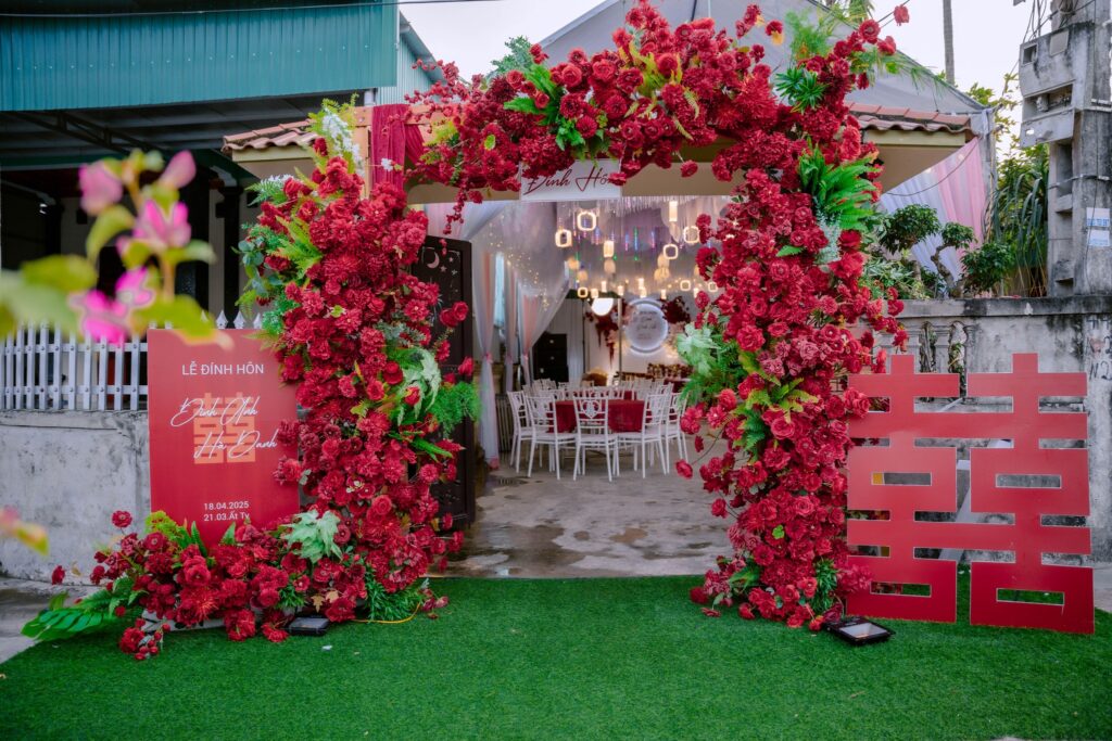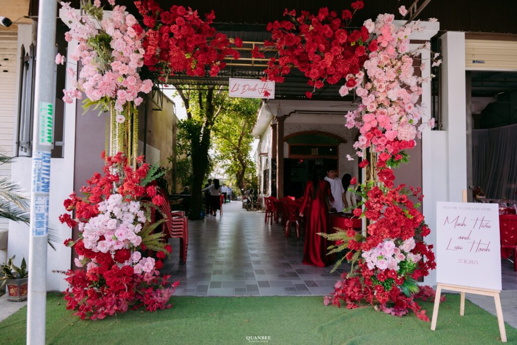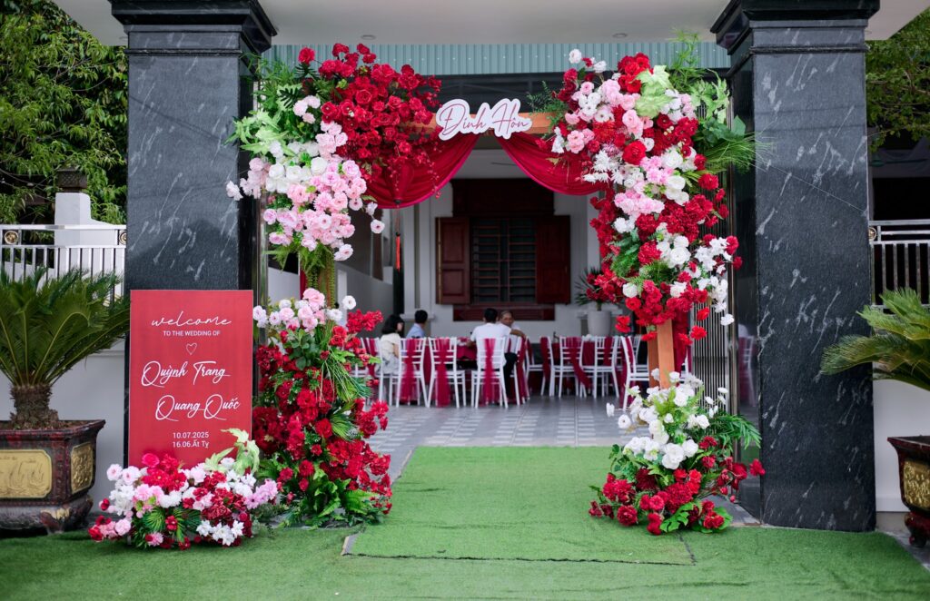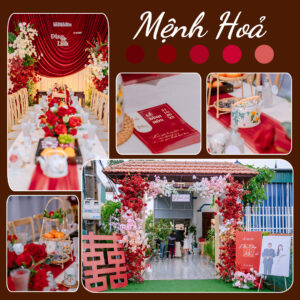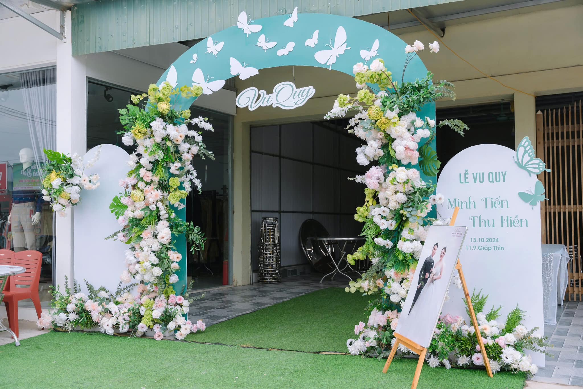 OKIO đã decor một chiếc back và phông cưới phù hợp hơn với không gian tư gia, trang phục, tráp cưới,… mà vẫn thể hiện được chất thẩm mỹ riêng. Từ khâu chọn hoa, lên 3D thiết kế, tư vấn từng cái cốc, khay đồ,… rất chu đáo, tỉ mỉ và lắng nghe yêu cầu của cô dâu, chú rể.
